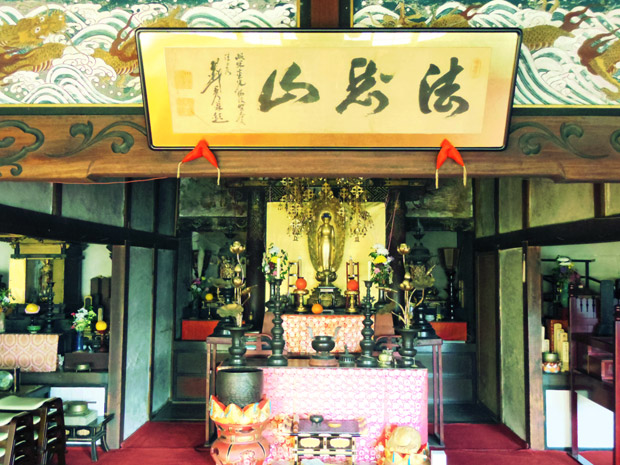 両側面に内法長押を通し、手前実長一間半までは一張りにして敷鴨居に二本溝があるので脇の間を内陣と区画した方丈型であった。後方一間分(脇仏環境)は土壁、小壁はすべて漆喰塗で内陣柱上内外まわりに斗きょうはなく棹縁天井。背面両端に半間巾の位牌壇と仏壇がつき腰框壇前に縦板、上部に虹梁、小壁は飛天奏楽の彩画を施す。来迎柱は円柱で頭貫端木鼻、台輪、柱上に出組斗きょうで天井棹縁を受ける。